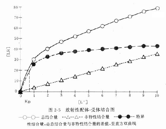 2.Scatchard图 推导得公式[LR]/[L]=[RT]/KD-[LR]/KD以[LR]/[L],为纵座标,[LR]为横座标作图也呈直线(图2-8),斜率为-1/[KD],与纵座标交点为[RT]/KD,与横座标交点为[RT]。