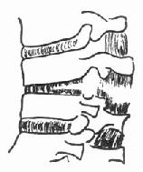 (二)旋转损伤 X线检查可见一个椎体在另一个椎体上旋转(图73-2)。有时可见椎间隙变窄,主要为纤维环及髓核损伤。下一个椎体的前缘上角,可被纤维环撕脱一小片,但椎体高度不变。少数仅有单纯椎间隙变窄,无纤维环撕脱。