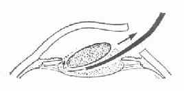 图9-7 核娩出 白内障外摘除术的主要优点是保留了晶体后囊,便于植入和固定人工晶体,适合于成年人核性白内障。目前在发达地区,囊外摘除术和人工晶体植入术是主要的手术方式。缺点是部分病人在术后1~5年内因后囊混浊影响视力,需再行后囊切开术。 (2)白内障囊内摘除术(intracapsular cataract extraction)是指离断晶体悬韧带之后将晶体完整摘除的手术。适应于老年性白内障有晶体硬核或晶体脱位者。术中可用特殊的囊镊夹住晶体前囊或经冷冻头与晶体冻结粘连在晶体前囊将晶体摘除切口外。(图9-8)。