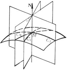 [任意平截线的曲率半径]  用通过点M的任意平面截曲面得截线C(图),它在点M的切线为PQ,曲线C的法线单位矢量为n,通过直线PQ和曲面的法线单位矢量N作意平面,截曲面得法截线。若矢量Nn夹角为,而的曲率半径为,则截线C的曲率半径为