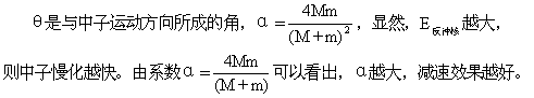M=m时(即反冲核的质量等于中子质量时)α最大为1,反之Mm的差距越大其α值越小。比较轻的物质的原子核的质量更接近中子的质量,因而α值大,减速效果好。