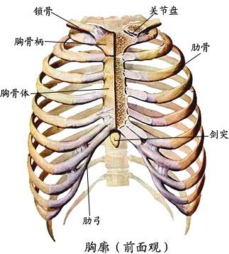 由12块胸椎、12对肋、1块胸骨构成。 By 12 thoracic vertebrae, 12 pairs of ribs, a sternum composition.