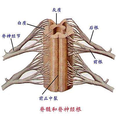 (1)前角:含有前角运动神经元,发出运动纤维,参与前根的组成。 (1) before the horn: Contains anterior horn motor neurons, issuing motor fibers, consisting of pre-roots participation.