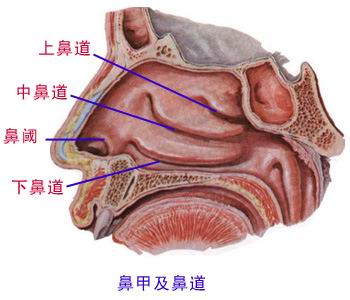 The nasal cavity is take the bone and the cartilage as the support, the inside lining mucous membrane and the skin becomes. The first hole passes the outside before the nose, after latter borrows the nose, Kong Tongyan. About middle is separated by the nose in divides into two. Each side divides the nose vestibule and the inherent nasal cavity. Outside the inherent nasal cavity on the sidewall has the upper, middle and lower three nose armor, underneath three nose armor respectively be upper, middle and lower three nasal passages. Before the next nasal passage, the share has the ductus nasolacrimalis aperture. The nasal cavity mucous membrane district is: