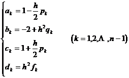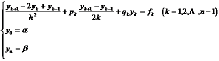where y k = y ( x k ), p k = p ( x k ), q k = q ( x k ), f k = f ( x k )    ( ). The above system of difference equations can be viewed as n + A linear algebraic equation system with unknown quantities y 0 , y 1 , y 2 , , y n , the number of equations is also n +1 . After sorting and merging similar items, the difference equation system can be rewritten as